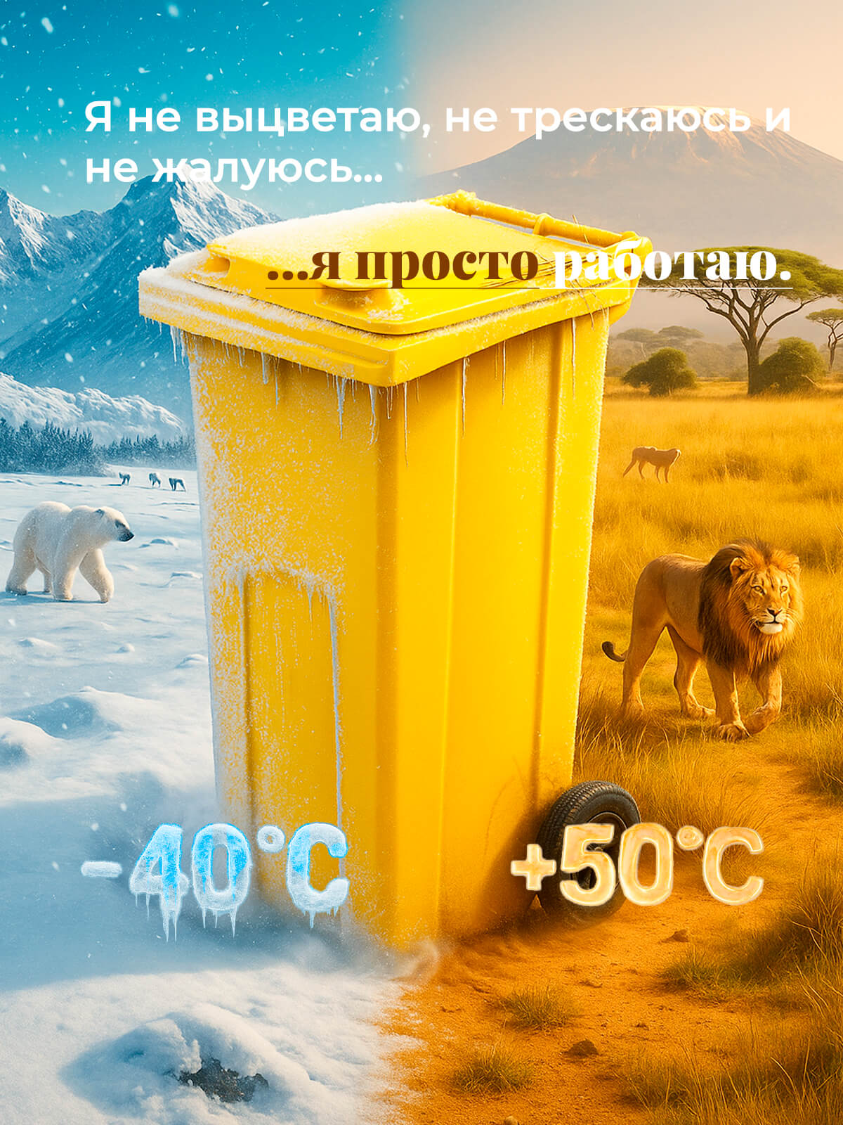 Благодаря прочным колёсам контейнер легко перемещается по любой поверхности. Корпус из первичного ПНД выдерживает морозы, удары и воздействие ультрафиолета, а плотная крышка надёжно удерживает запахи и защищает от осадков.